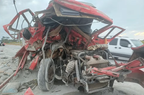 Os caminhões permanecem no local, aguardando remoção, e carga se espalhou pela rodovia, gerando bloqueio parcial e lentidão no trânsito local.