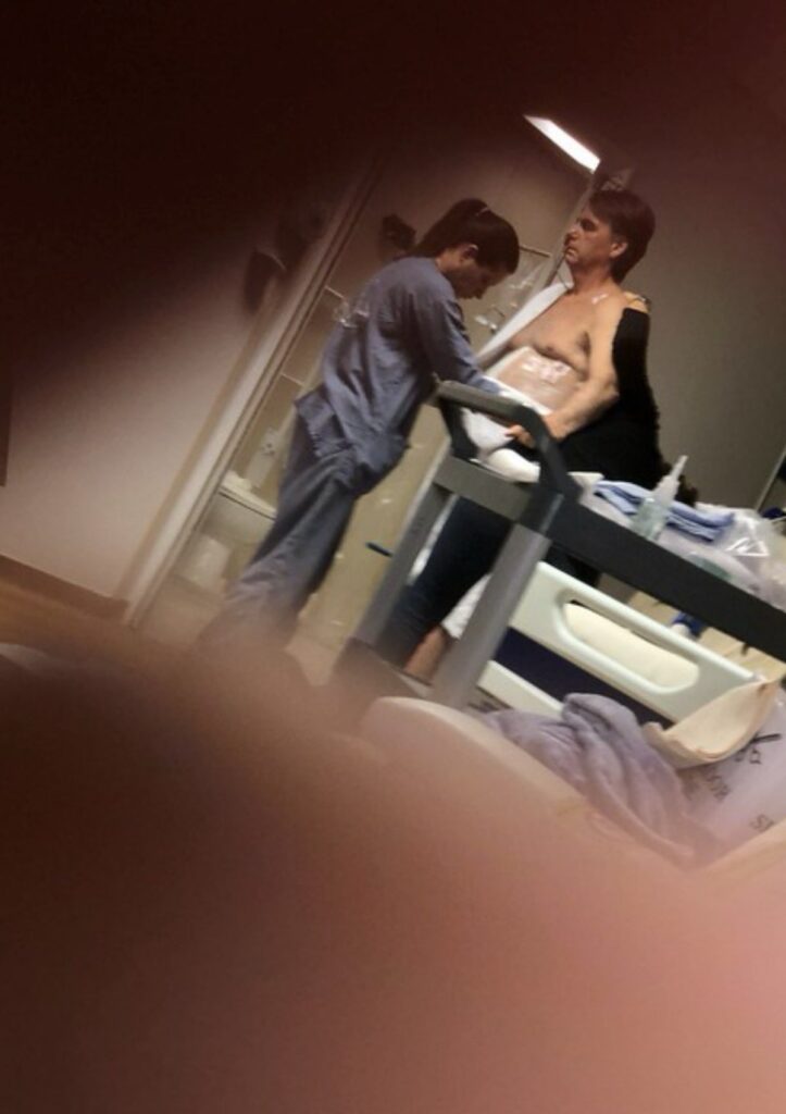 O filho de Jair Bolsonaro publicou uma foto do pai no hospital, sem camisa, sendo atendido por uma profissional de saúde, mas sem especificar a data.